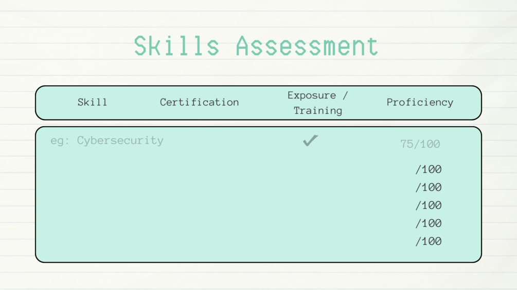 Understanding your skills is the cornerstone to any successful career plan. This could be in form of direct skills like proficiency in a specific field, for example, cybersecurity with a score of 75/100. It could also be indirect skills, like certifications and training completed in your area of interest.