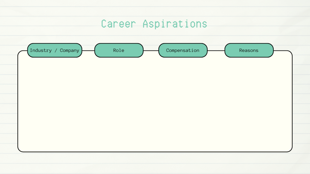 While career goals are specific targets, career aspirations are about your long-term professional ambitions. What industry or company do you aspire to work in? What role do you see yourself in? What compensation package are you aiming for? And most importantly, why do you aspire to these things? Reflecting on these aspects will help you make informed decisions about your future.