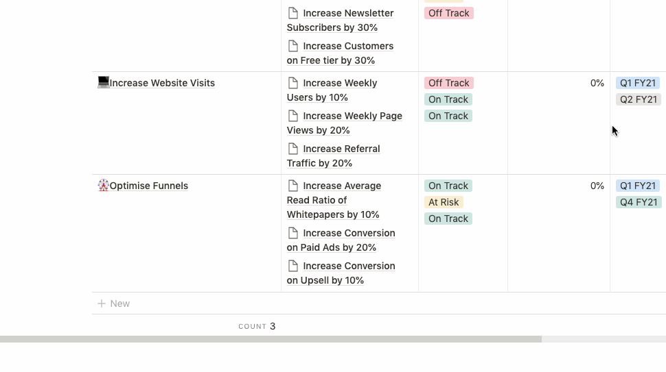 There are also multiple views to help teams visualize and track progress in a way that suits them, for eg: By quarter, by status, by time (calendar). Â