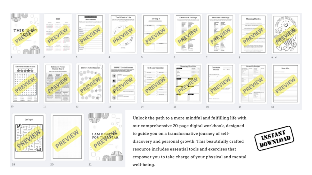 Unlock the path to a more mindful and fulfilling life with my comprehensive 20-page digital workbook, designed to guide you on a transformative journey of self-discovery and personal growth. This beautifully crafted resource includes essential tools and exercises that empower you to take charge of your physical and mental well-being.